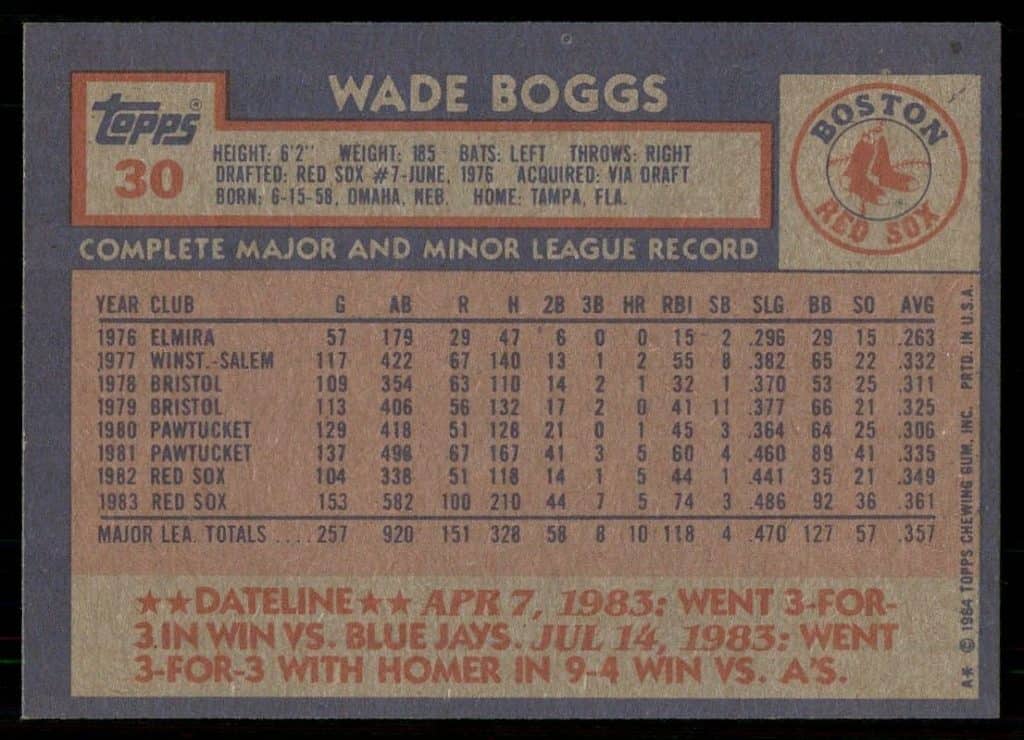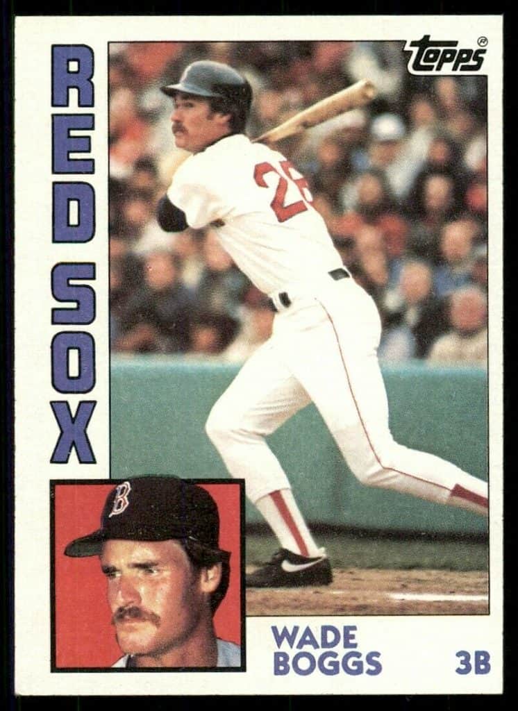 The 1984 Wade Boggs is the card for his second year. The card shows Wade Boggs action image most likely hitting a line drive and is about to head to first base for a single. The headshot at the bottom left shows serious Wade with a red face probably from sun burn. The year prior Wade Boggs his .349, had 210 hits, and still only came in third for rookie of the year after the great Cal Ripken and Kent Hrbek.