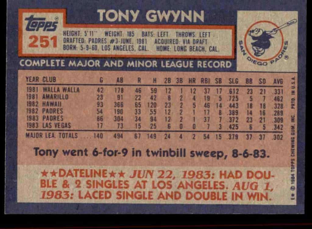 The 1984 Topps Tony Gwynn is his second year card. It features Tony taking practice swings before he gets in there to line a hit and get on base. The small box on the left contains a headshot of Tony Gwynn with a serious look. The year prior Gwynn had a steller year batting .372 in 304 at bats. Great start to a hall of fame career.