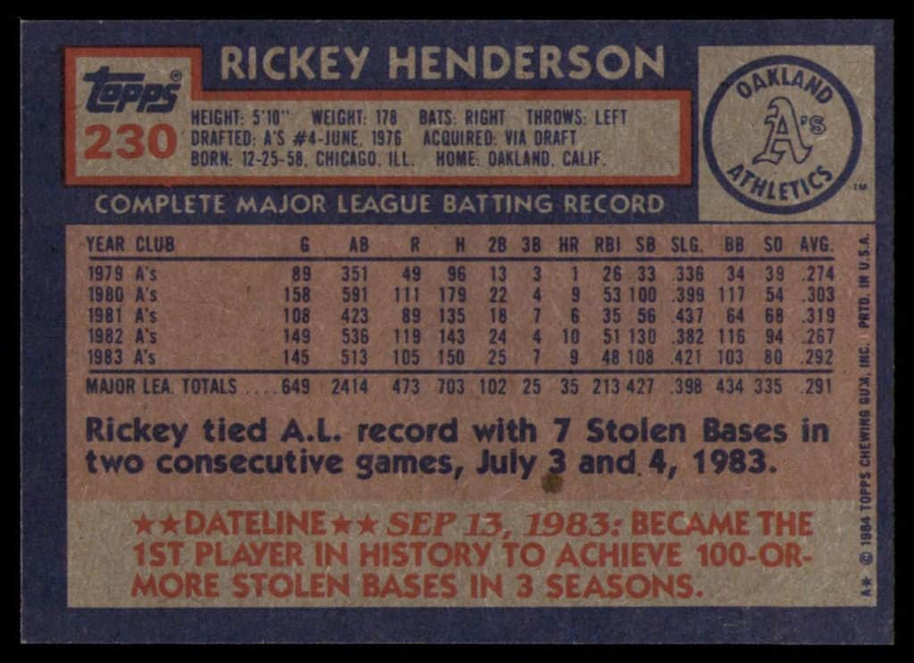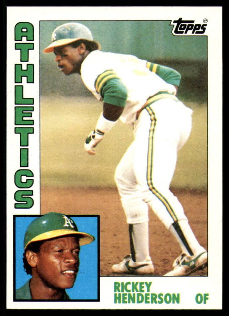 The 1984 Topps Rickey Henderson is just a beautiful card of Rickey. And as he would say “Rickey can run”. The card shows Rickey leading off and ready to get another one of this 108 stolen bases he got during the previous season. That was also his third time stealing over 100 bases for they year up until this point.
