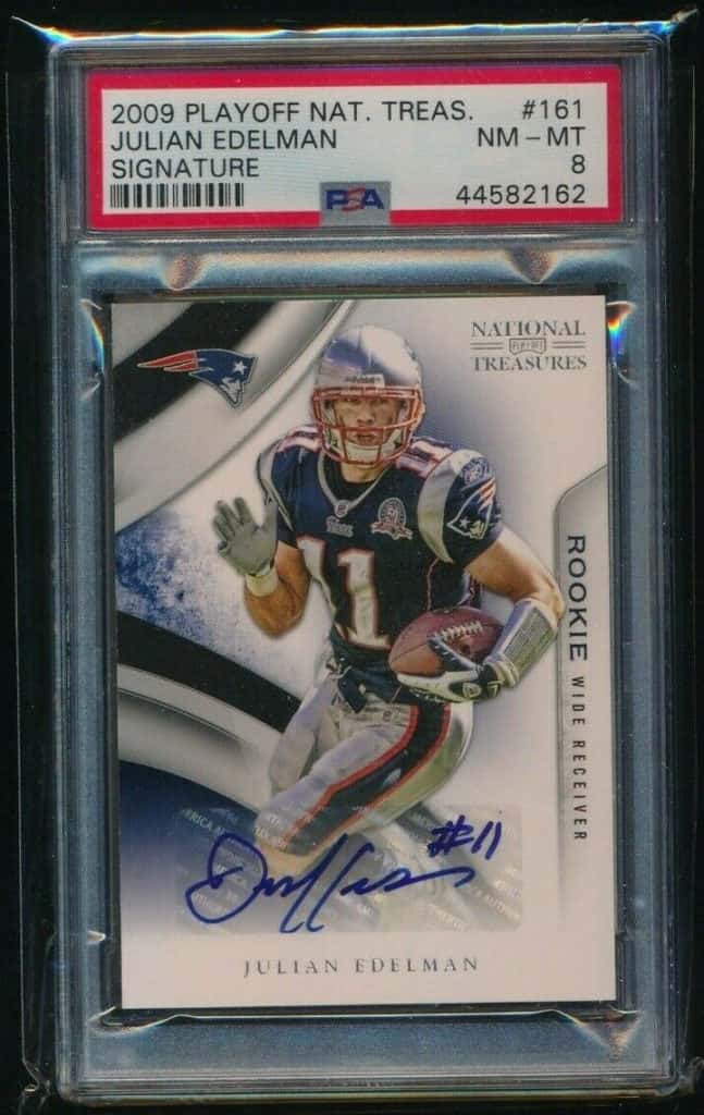 Julian Edelman seems ready to dive into the game with his football. At the top right side is the official logo of “Playoff National Treasures” with players playing positions in the team mentioned below. The left side has the “New England Patriots” official logo. You can find Edelman’s signature and name at the bottom. The backside has another image with his Collegiate Totals.