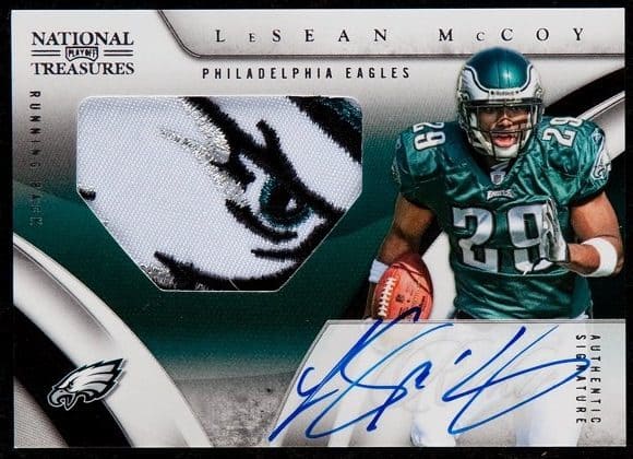 LeSean McCoy seems ready to leap into the 2009 Playoff National Treasures football card game. The top right side has the “Playoff National Treasures” logo with McCoy playing position team mentioned below it, followed by his signature and name at the bottom. The left side has the “Philadelphia Eagles” official logo. The backside features a different image with his Collegiate Totals.