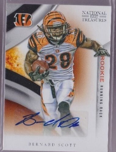 While running with the football, the Bernard Scott card is uniquely designed with the “Playoff National Treasures” logo on the top right. Below is his position in the team with his signature and name at the bottom. The left side has the official logo of “Cincinnati Bengals.” The backside has a different image from his Collegiate Totals.