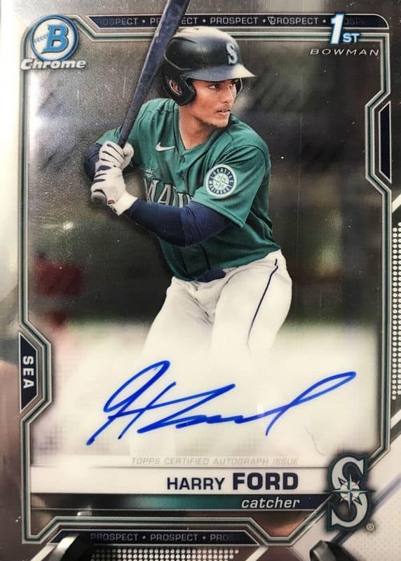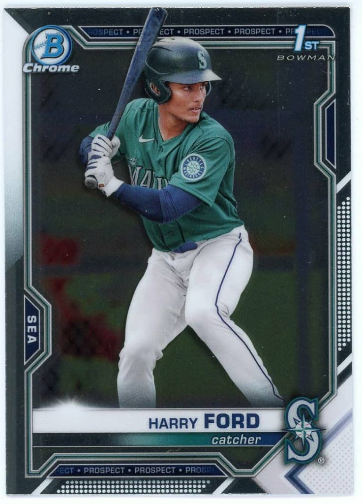 The card shows Harry Ford in position, ready to hit the ball. The right bottom side has the official logo of the Seattle Mariners, along with his name and position mentioned. The backside has his previous record with skills and up close information.