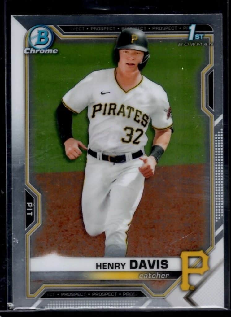The card has Henry Davis running in the field. The official logo of Pittsburg Pirates is at the bottom right side with his name and position mentioned along with it. The backside features Davis records.