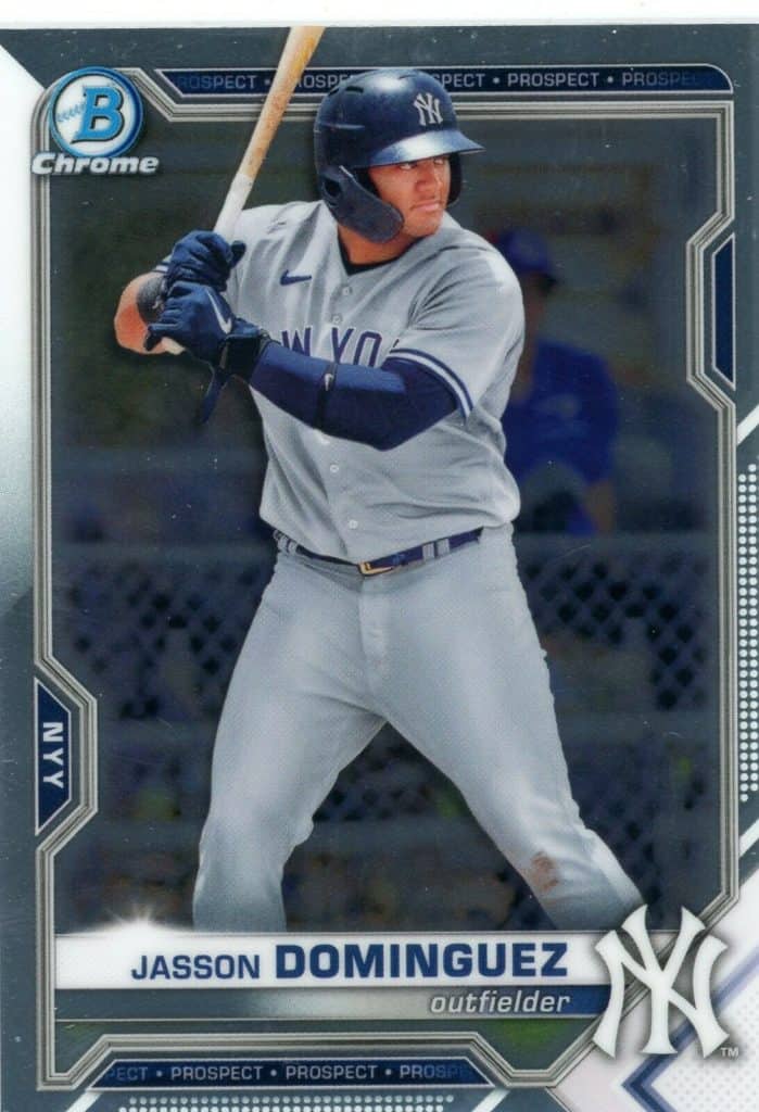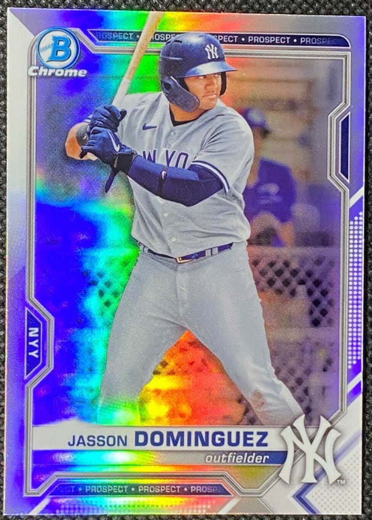 The outfielder in the card is shown running with his helmet on his head. The right bottom side features the original logo of the New York Yankees, with his name and position mentioned together. The backside has Jasson Dominguez’s batting record with his skills discussed in detail.