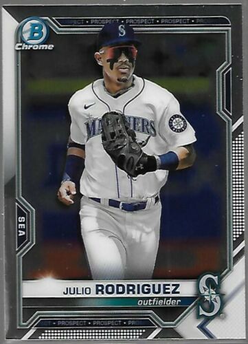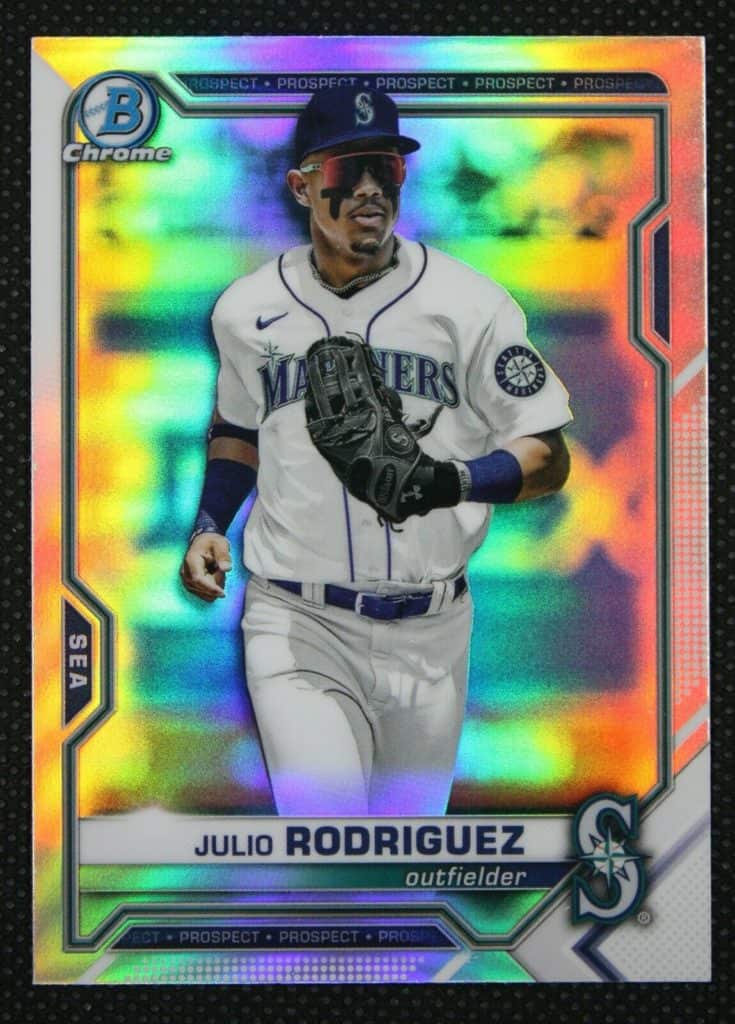 The 2021 Bowman Chrome Draft has Julio Rodriguez ready to fearlessly face the ball. At the bottom right side of the card is the official logo of the Seattle Mariners, with his name and position in the team. The backside has his minor league batting record with his skills mentioned.
