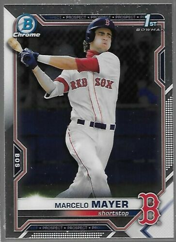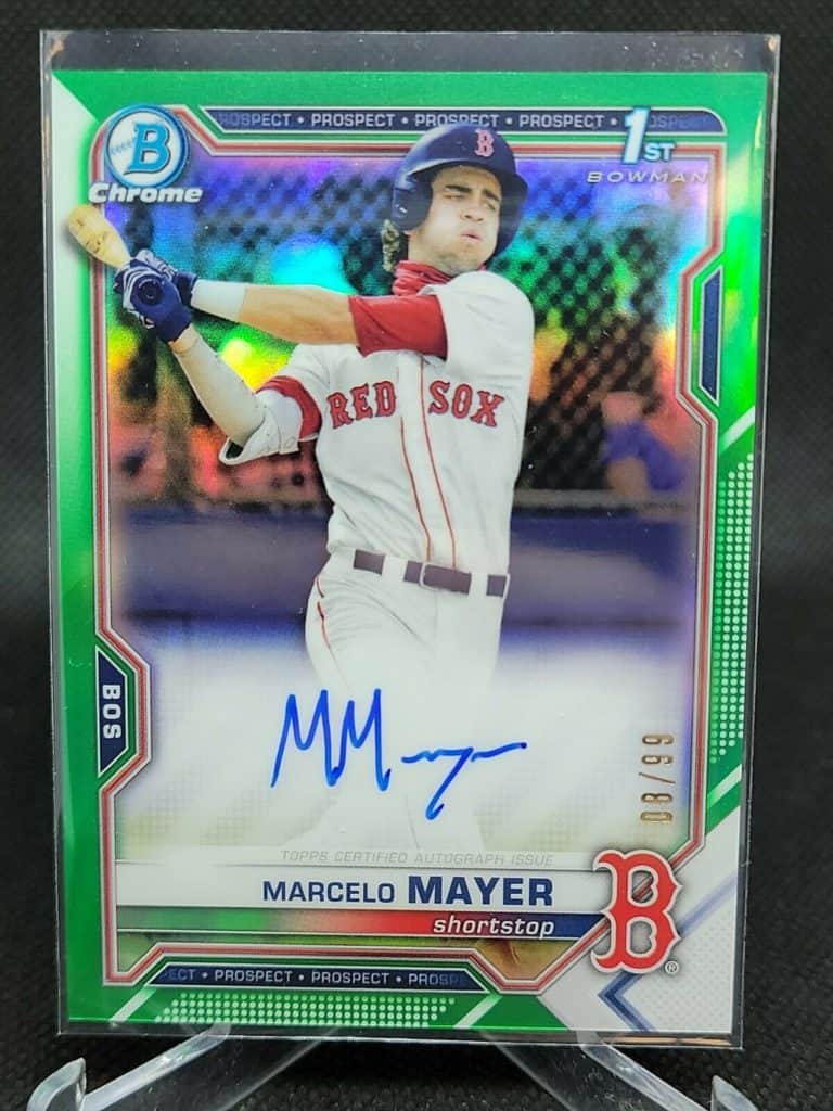 2021 Bowman Chrome Draft card has Marcelo Mayer in action, after hitting a powerful shot. At the bottom right side is the official logo of the Boston Red Sox. The backside of the card has his High School batting record with other interesting facts and skills.