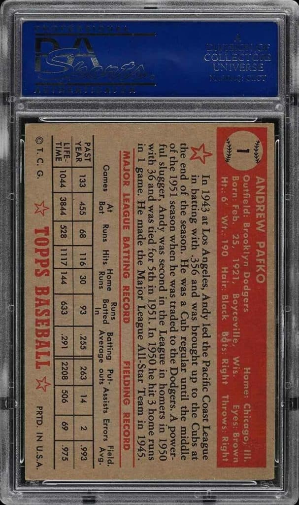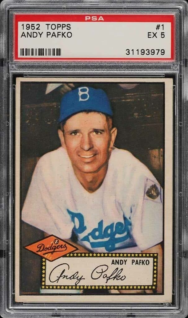 This is the 1952 Topps Andy Pafko baseball card. It has a picture of him wearing his new Brooklyn Dodgers uniform and has a smile. Topps decided to put Andy Pafko as card number 1 in the set because of his good 1951 season that sparked an eight player trade between the Chicago Cubs and Brooklyn Dodgers. Because it was the first card, and because most kids from that time wrapped their cards in rubber bands, the And Pafko was always the first card in the rubber band stack and because of that there are very few around in good condition.