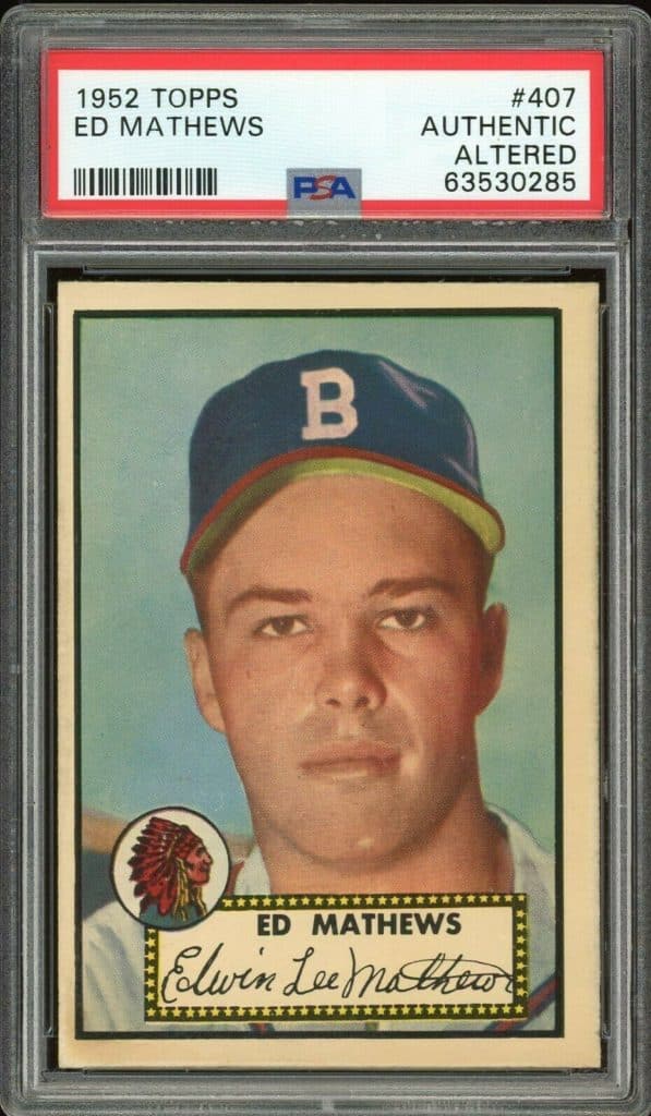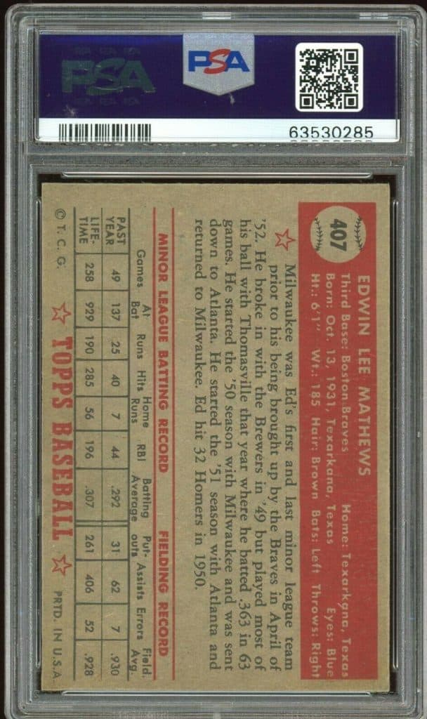 This is the 1952 Topps Eddie Mathews rookie baseball card. It has a nice picture of Eddie wearing a Boston Braves hat and uniform along with the team logo of an Indian and his name and facsimile autograph. The back of the card talks about how Eddie Mathews first and last minor league team was Milwaukee.