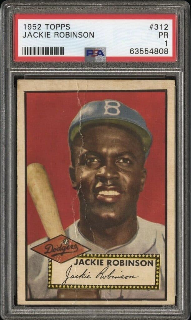 This is the 1952 Topps Jackie Robinson baseball card. The card shows Jackie wearing a Brooklyn Dodgers uniform while holding a bat and smiling. The back of the card states that Jackie Robinson was the National League Rookie of the Year in ’47.