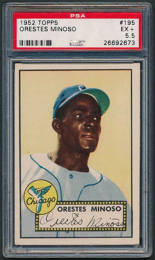 This is the 1952 Topps Minnie Minoso baseball card. The card has a picture of Minnie wearing his Chicago White Sox had and uniform. The back of the card states that “Minnie” hit a home run in his first game with the Indians, and also hit a home run in his first game with the White Sox.