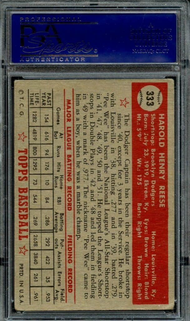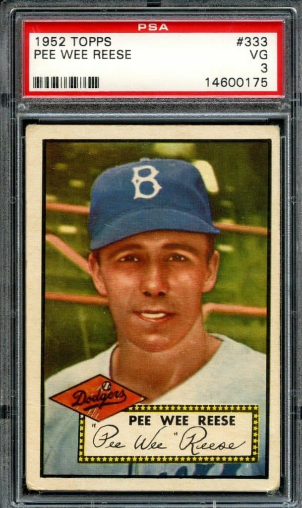 This is the 1952 Topps Pee Wee Reese baseball card. The front shows a great picture of Pee Wee wearing his Brooklyn Dodgers uniform and hat. The back of the card states that Pee Wee, the Dodgers Captain, has been their regular shortstop since ’40, except for the 3 years he spent in the service.