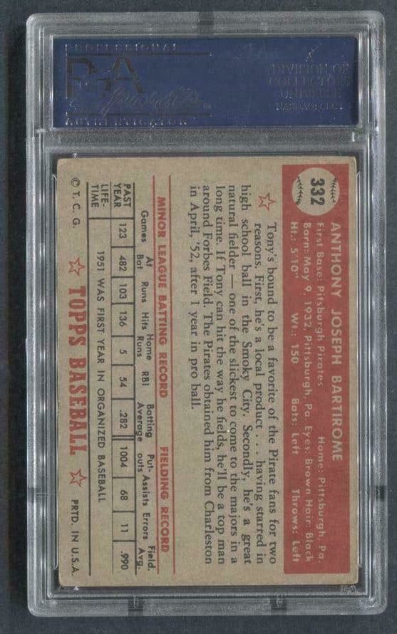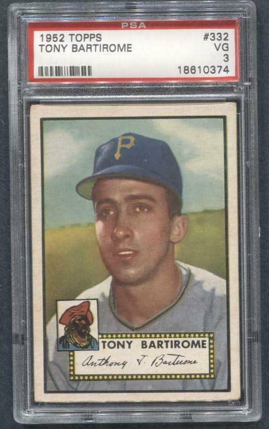 Here is the 1952 Topps Tony Bartirome rookie baseball card. It shows Tony wearing the Pittsburg Pirates uniform and hat. The back says that Tony’s bound to be a favorite of the Pirates because he is a local product.