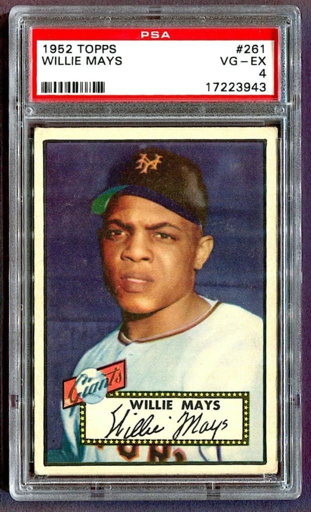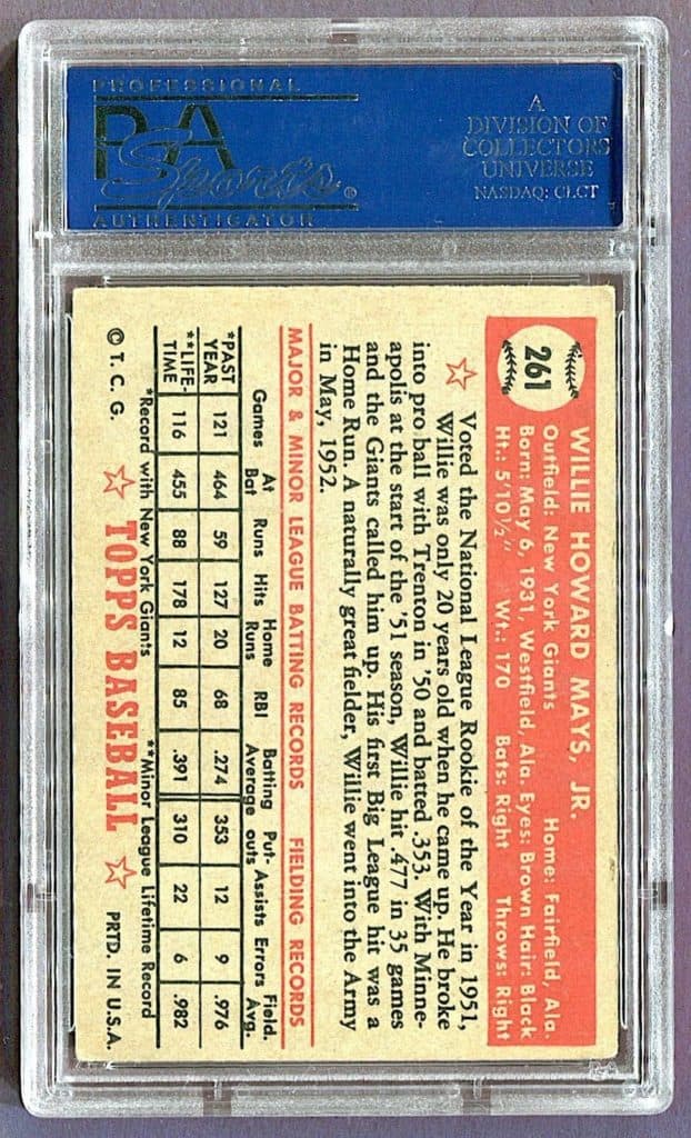 The 1952 Topps Willie Mays baseball card has a picture of him on the front of the card wearing his New York Giants hat and uniform showing a serious look. The back of the card states that Willie Mays was the National League Rookie of the Year in 1951.