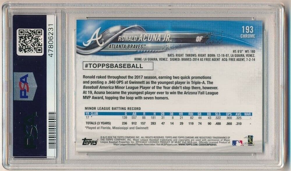 The 2018 Topps Chrome card of Ronald Acuna Jr. shows him hitting hard with all his might. There is the official logo of Topps Chrome on the left side of the card, with the Atlanta Braves logo on the bottom left side. At the backside, you can find his minor league batting record.