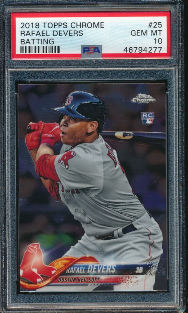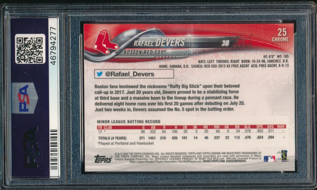 The 2018 Topps Chrome rookie card has Rafael Devers in action after hitting the ball. On the right side of the card has the official logo of Topps Chrome. Whereas, the left bottom features a logo of the Boston Red Sox. The backside has his minor league batting record.