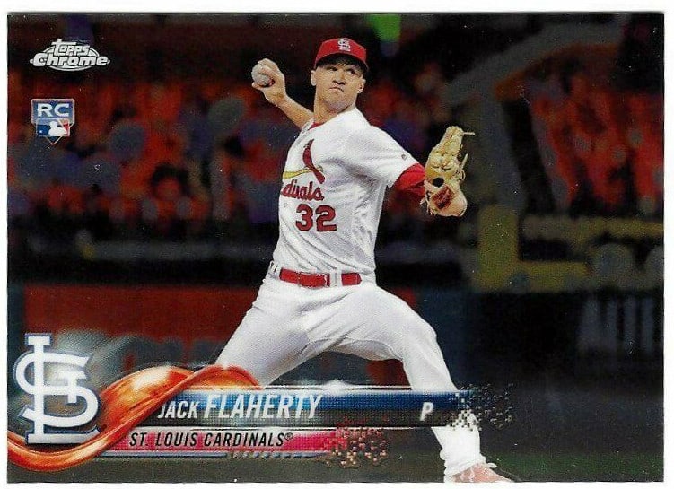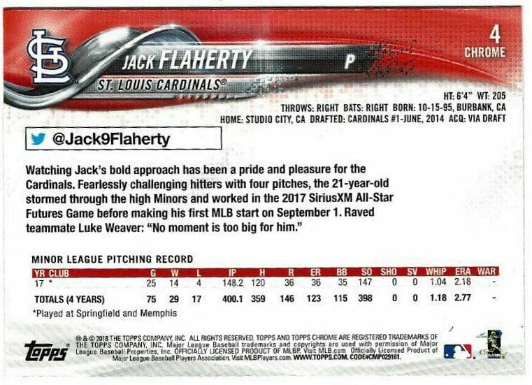 In action throwing the ball, Jack Flaherty’s horizontal card has his pitching records from the minor league at the back. In the front, there are Topps Chrome and St. Louis Cardinals official logos.