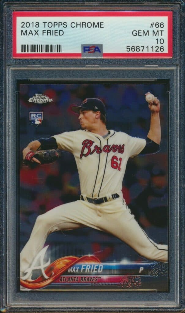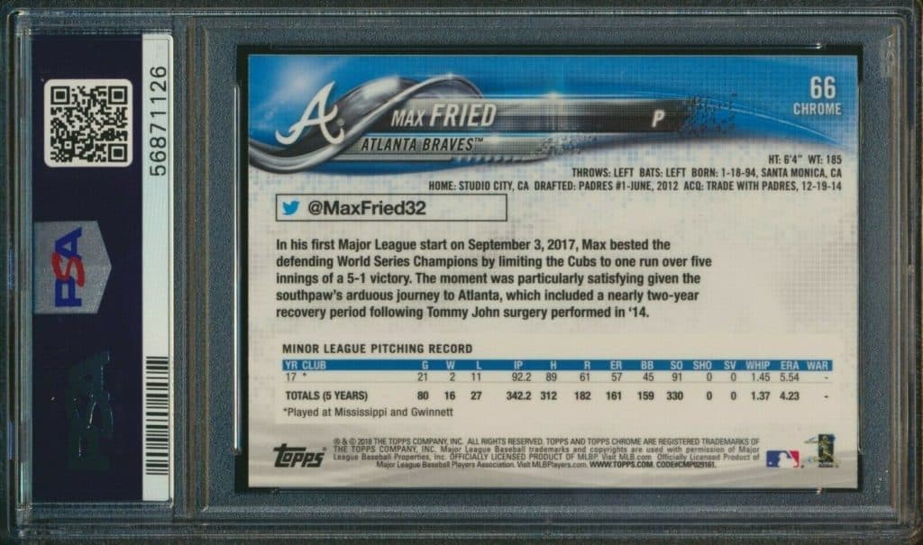 With the Topps Chrome logo on the top left and the Atlanta Braves official logo on the bottom left, the shiny card has Max Fried in action. He is ready to throw the ball and rule the field. The backside of the card has Fried’s minor league pitching record in complete detail.