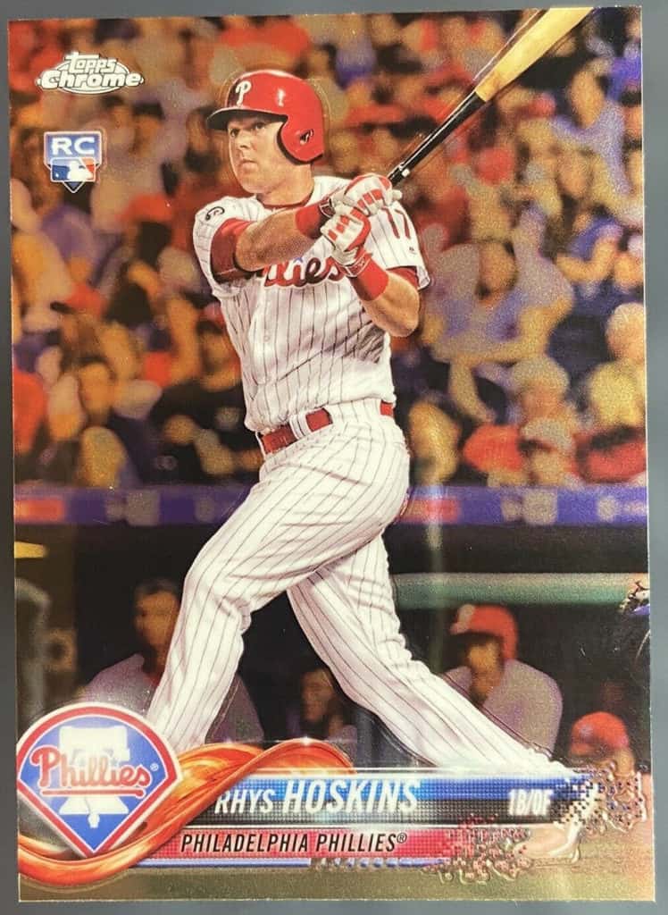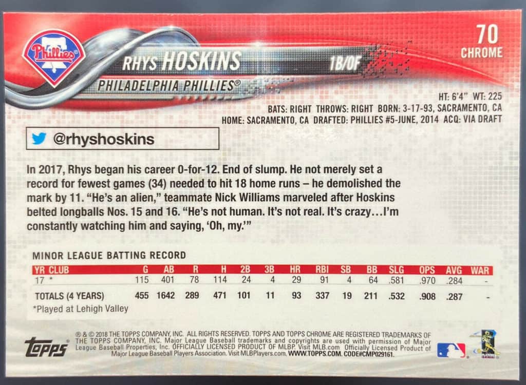 It’s a pink refractor for Rhys Hoskins where he’s in action after hitting the ball. The backside of the card has his minor league records, and the front has Topps Chrome and Philadelphia Phillies official logo.