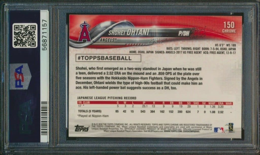 The card shows Shohei Ohtani pitching and ready to deliver. The left bottom corner is the logo of Los Angeles Angels with Ohtani’s name in front. At the top left side is the official logo of Topps Chrome. And the backside is his Japanese League pitching record.