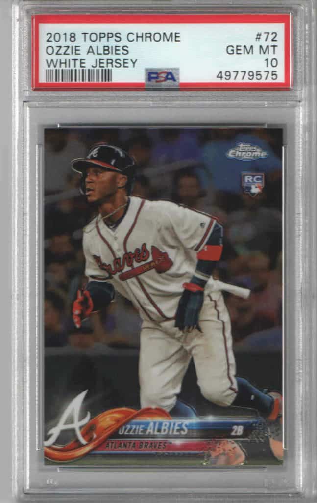 In the beautiful white jersey, Ozzie Ablies is seen running after smashing the ball. The backside of the card has his wonderful minor league record. While the right top of the card has Topps Chrome official logo and the left bottom has Atlanta Braves “A” logo.