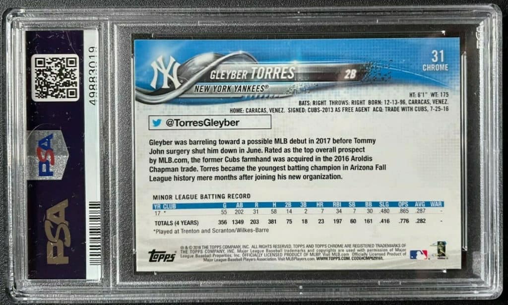 The card features Gleyber Torres running after hitting the ball with his bat. On the left side of the card, fans can find the logo of Topps Chrome. Along with is the official logo of the All-Star Game. At the backside of the card, there is his minor league batting record.