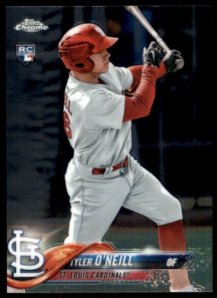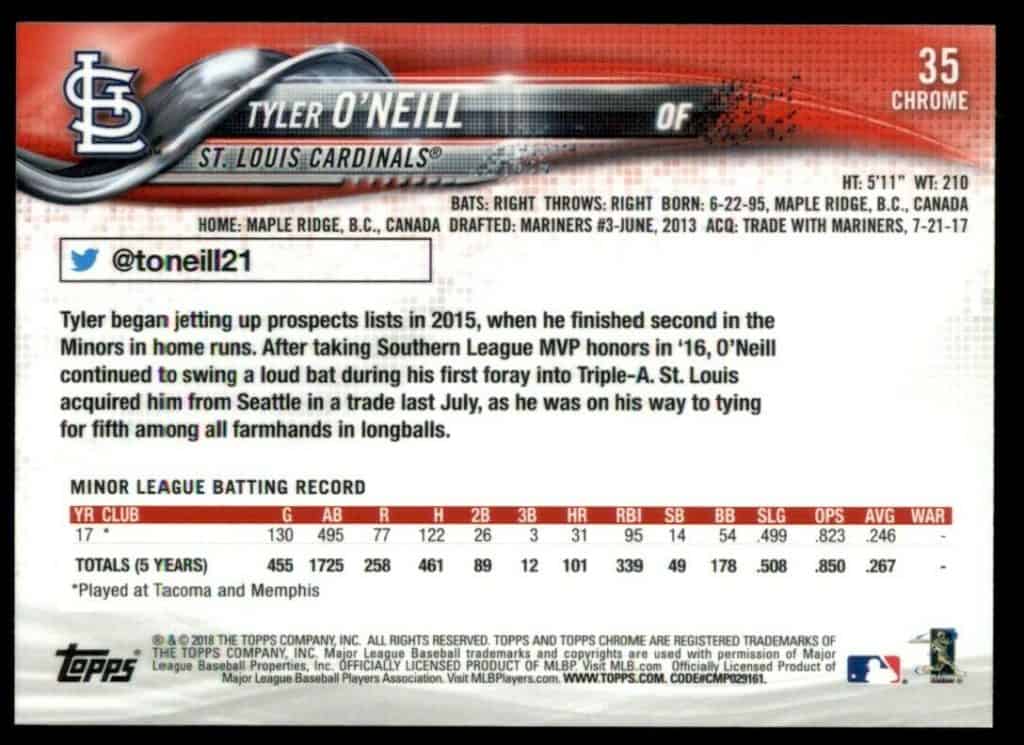 2018 Topps Chrome rookie card of Tyler O’Neill shows him in action after hitting the ball. The bottom left of the card has St. Louis Cardinals logo and the left top side has the Topps Chrome official logo. The backside illustrates his exceptional minor league batting record.