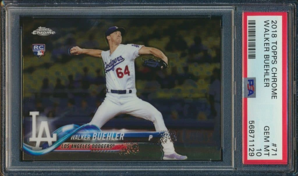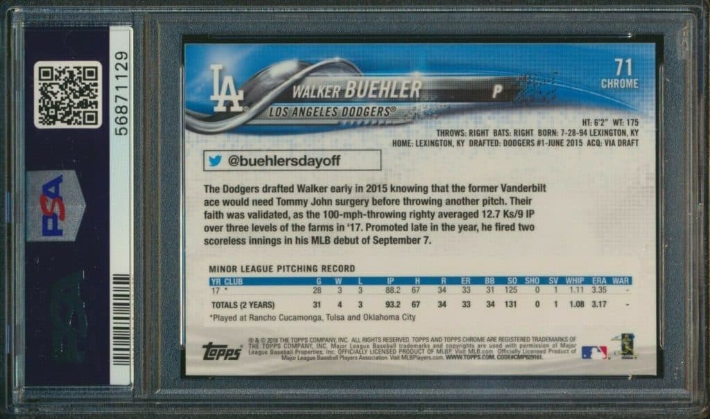 It is an outstanding horizontal card, showing Walker Buehler throwing the ball with all his strength. The left side has the Topps Chrome logo, and the left bottom features the official Los Angeles Dodgers logo. The backside has his minor league pitching record for reference.